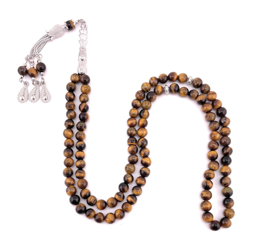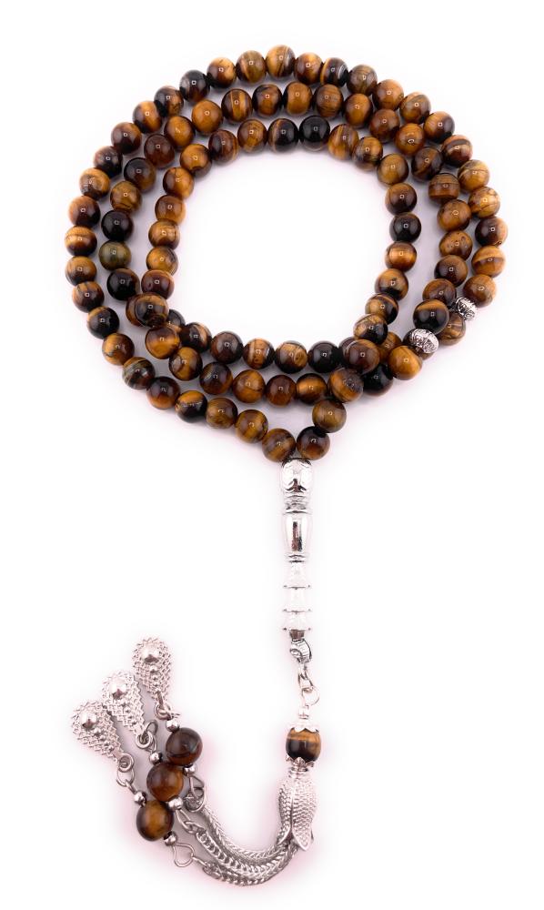 1. المظهر الجمالي المميز: حجر عين النمر يتميز بلونه البني الذهبي اللامع وبتموجات تشبه عين النمر، مما يعطي السبحة مظهراً جميلاً وجذاباً يلفت الأنظار.