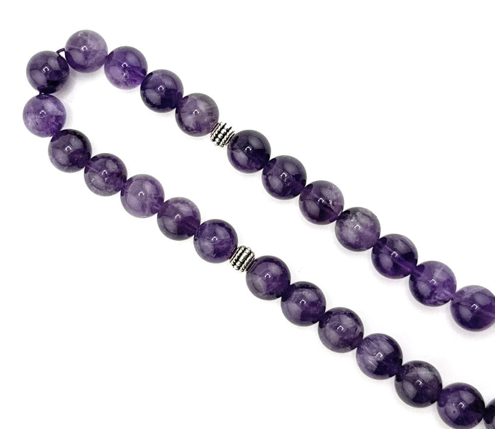 • تأسر سبحة حجر الأميثيست الطبيعي القلوب بتوهجها الأرجواني العميق وبريقها المتناغم مع انعكاسات الضوء.