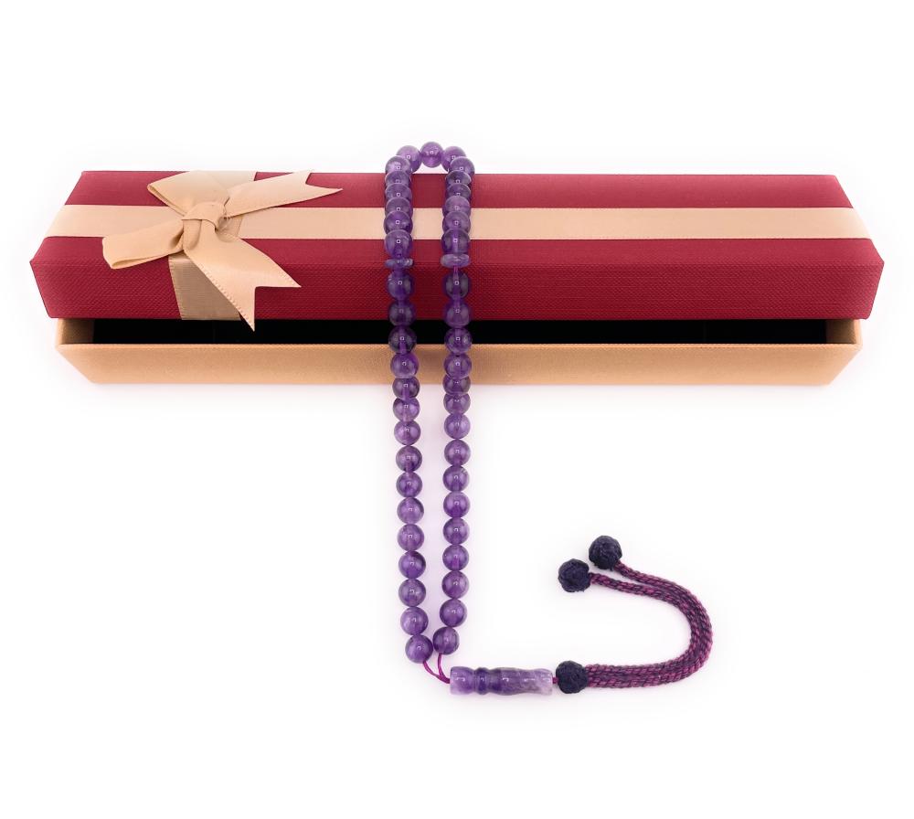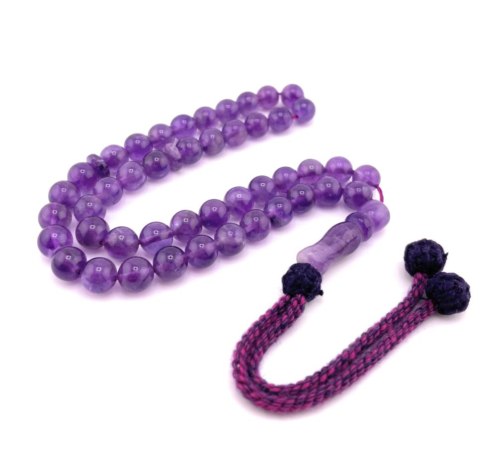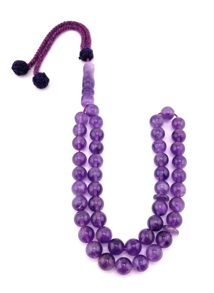 • هذه المسبحة المصنوعة من حجر الأماثيست (الجمشت) تتميز بلونها البنفسجي العميق والجذاب.