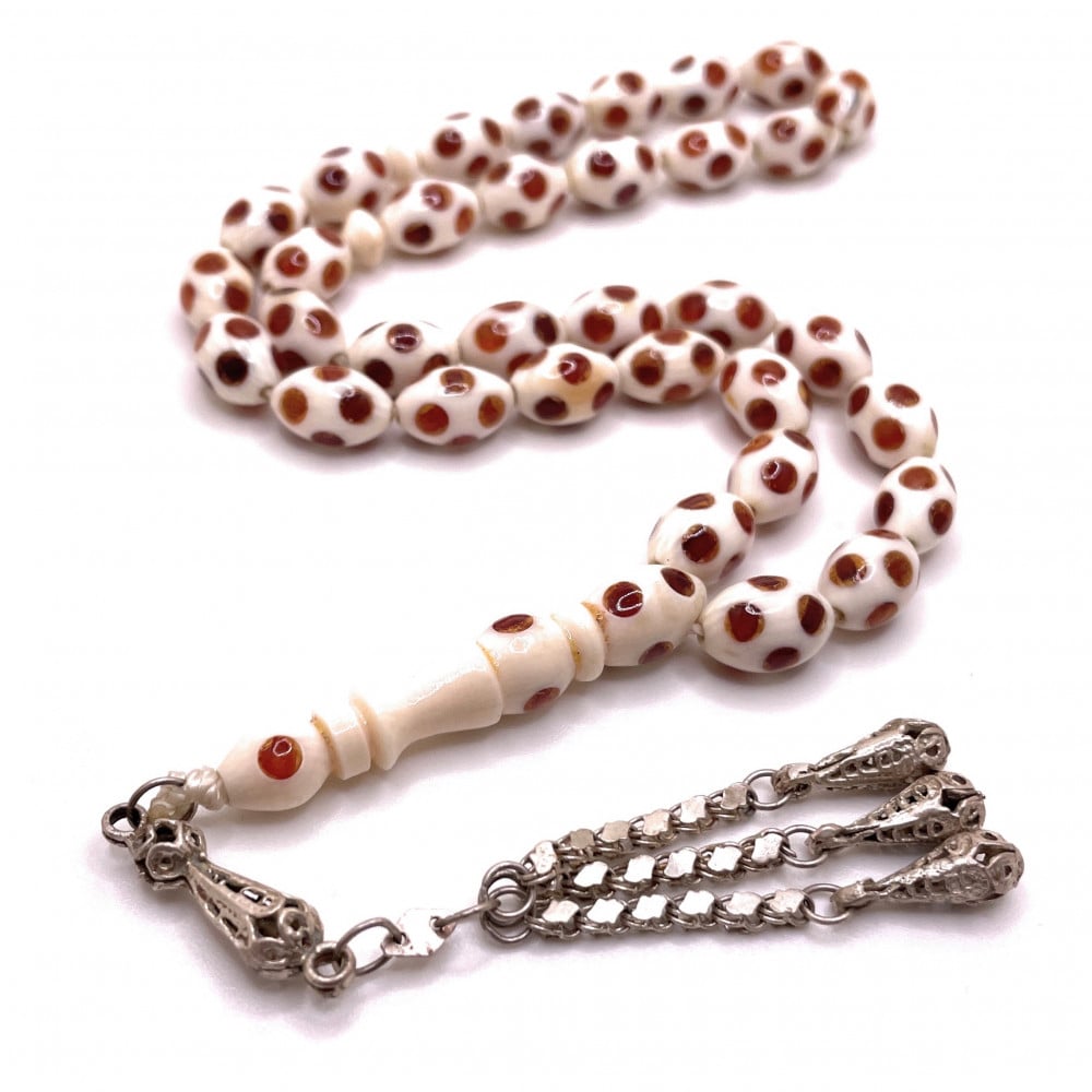 سبحة عاج فيل مشغول بالكهرمان مع كركوشة فضة عيار 925