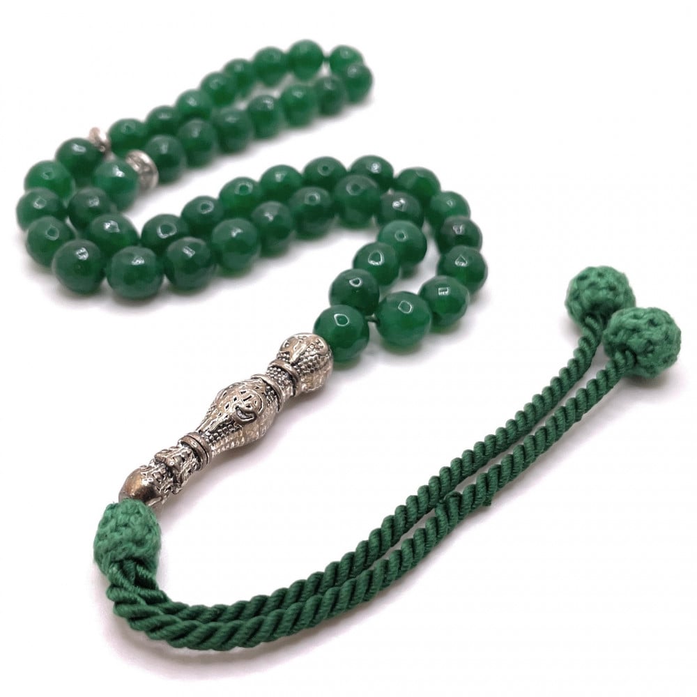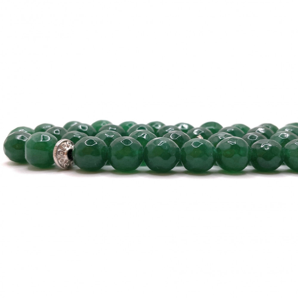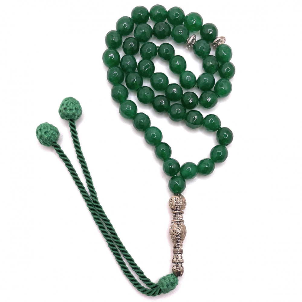 سبحة عقيق اخضر بتقطيع كريستالي مع كركوشة مشغولة يدويًّا بخيط حريرمواصفات سبحة العقيق:عدد الخرز: 45مقاس الخرز: 8 ملموزن السبحة: جمطول السبحة: 30سم