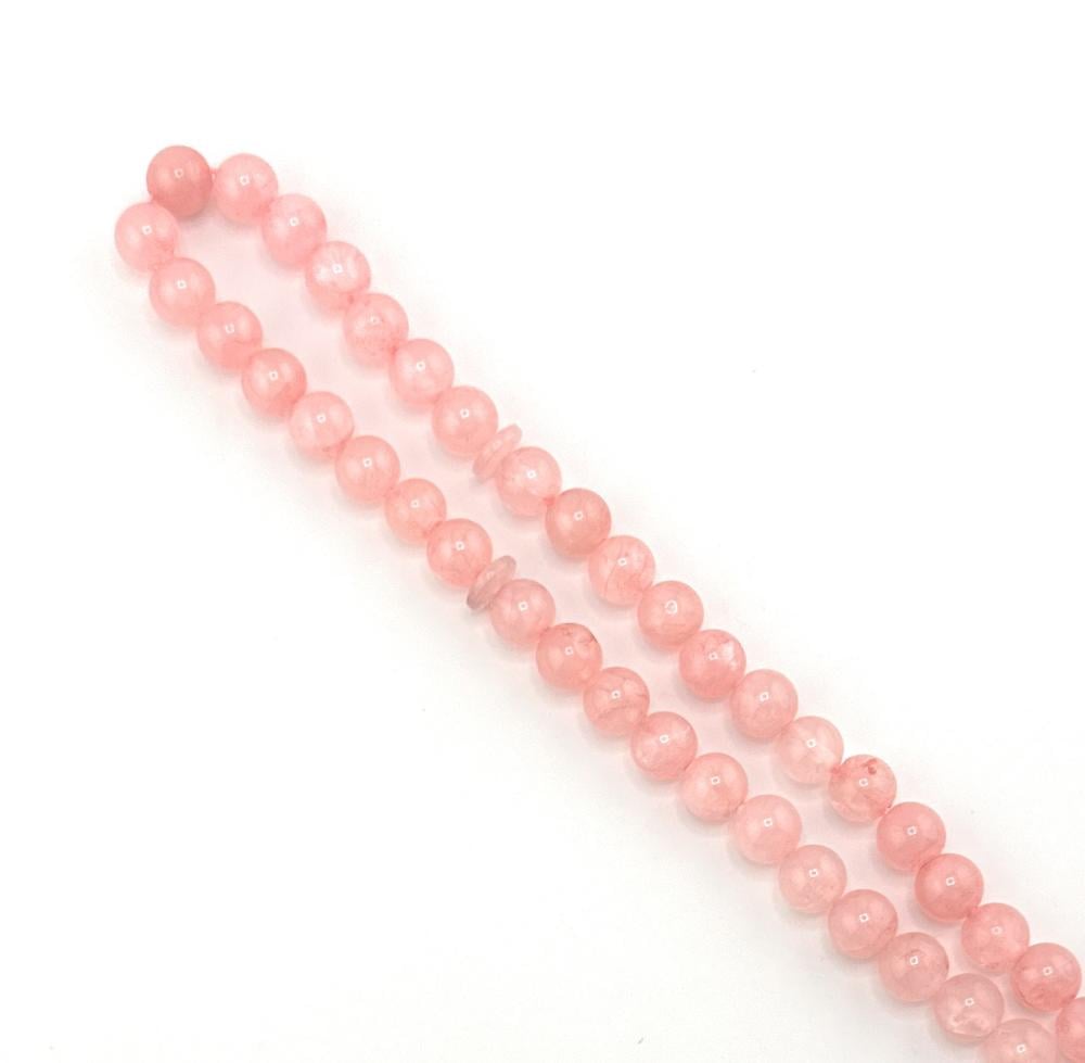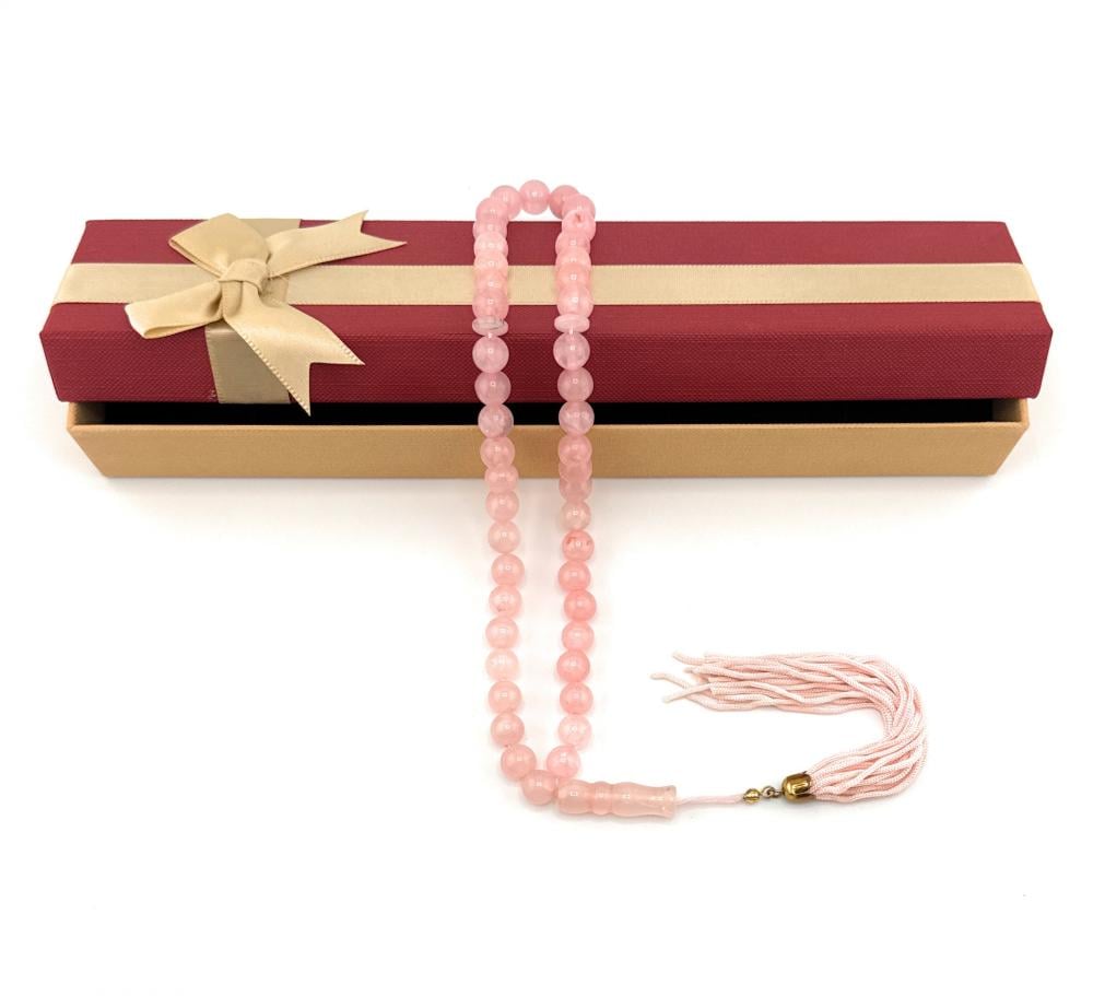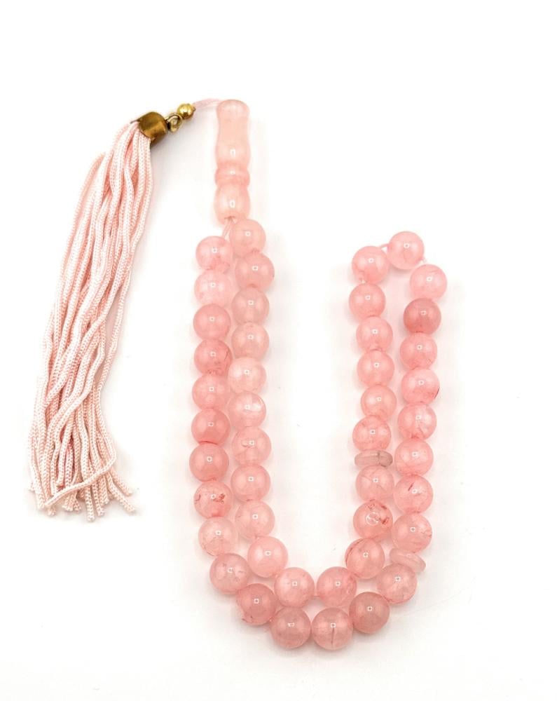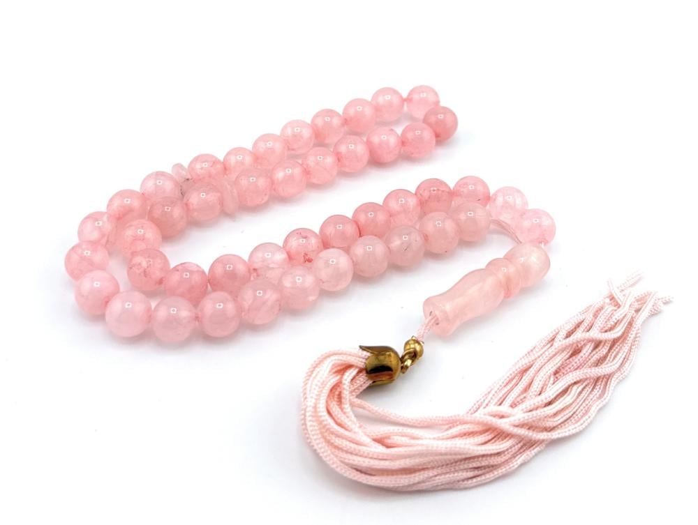 • تصميم هذه المسبحة يوحي بأنها قد تكون مصنوعة من حجر الكوارتز الوردي (Rose Quartz)، وهو حجر يرتبط بالسلام الداخلي والحب.