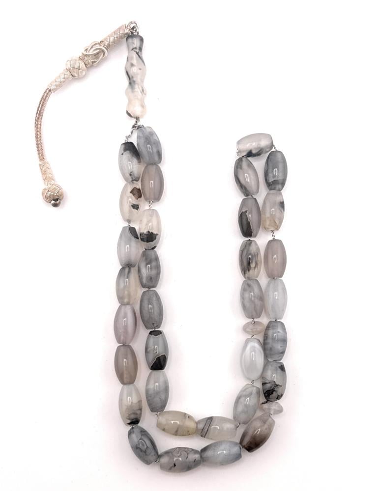 - الحبات مصنوعة من عقيق يماني أصلي حر، يتميز بملمسه الناعم وتنوع ألوانه الفاتحة مع شفافية خفيفة وتداخلات رمادية ساحرة.